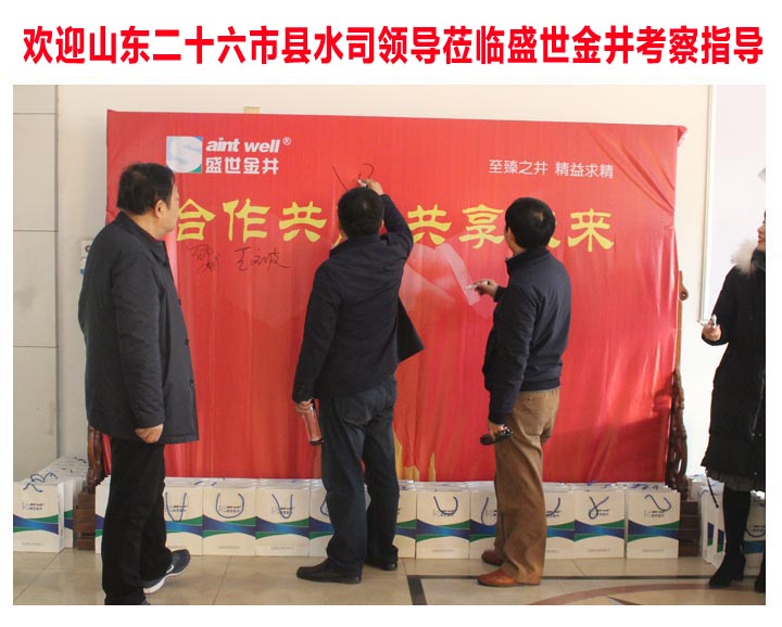2017年12月23日,山東省二十六市縣水司大型領(lǐng)導(dǎo)考察團(tuán),蒞臨盛世金井參觀考察。盛世金井董事長(zhǎng)、營(yíng)銷中心總經(jīng)理、技術(shù)部經(jīng)理、市場(chǎng)部經(jīng)理、銷售助理及相關(guān)領(lǐng)導(dǎo)熱情接待。