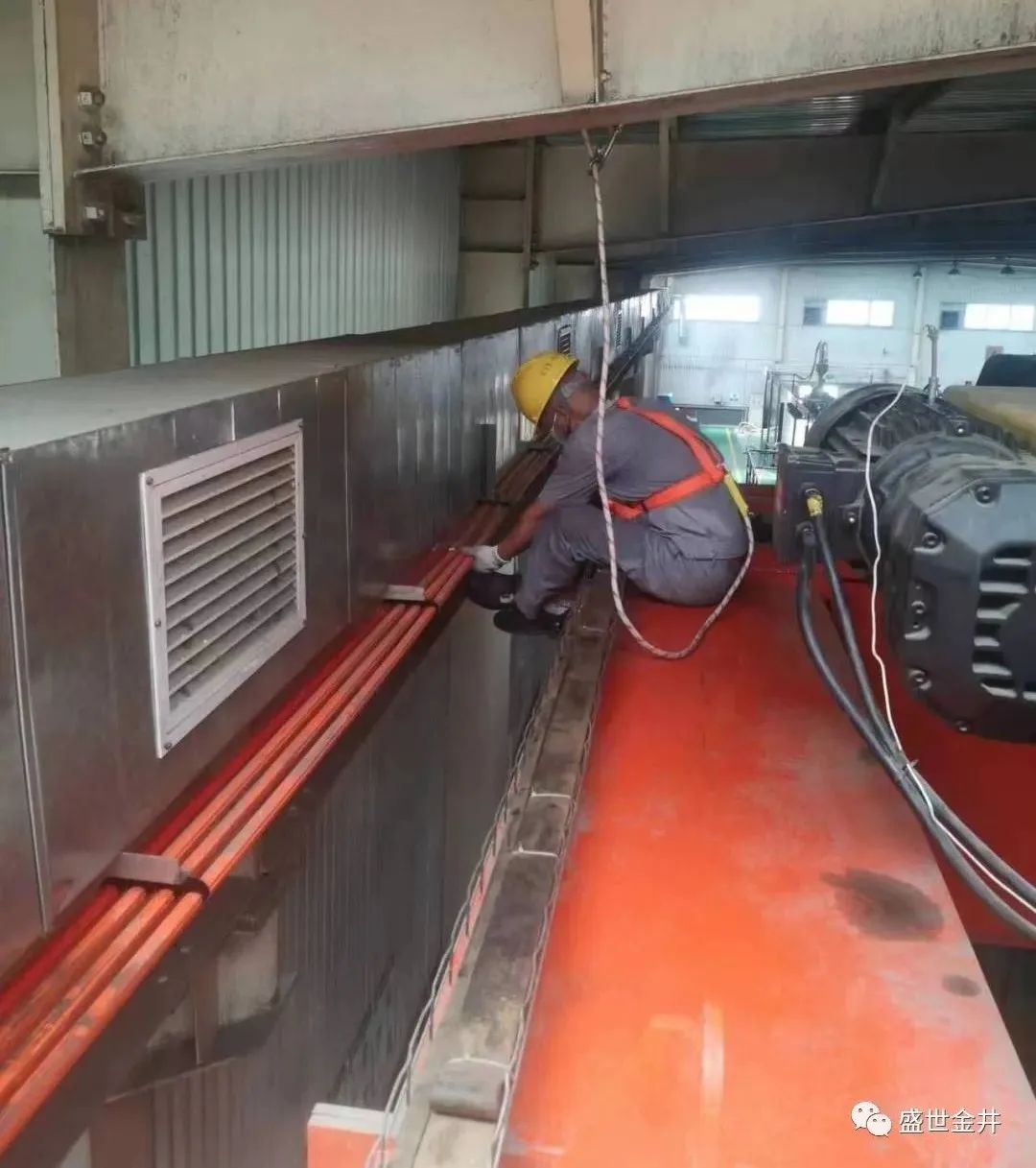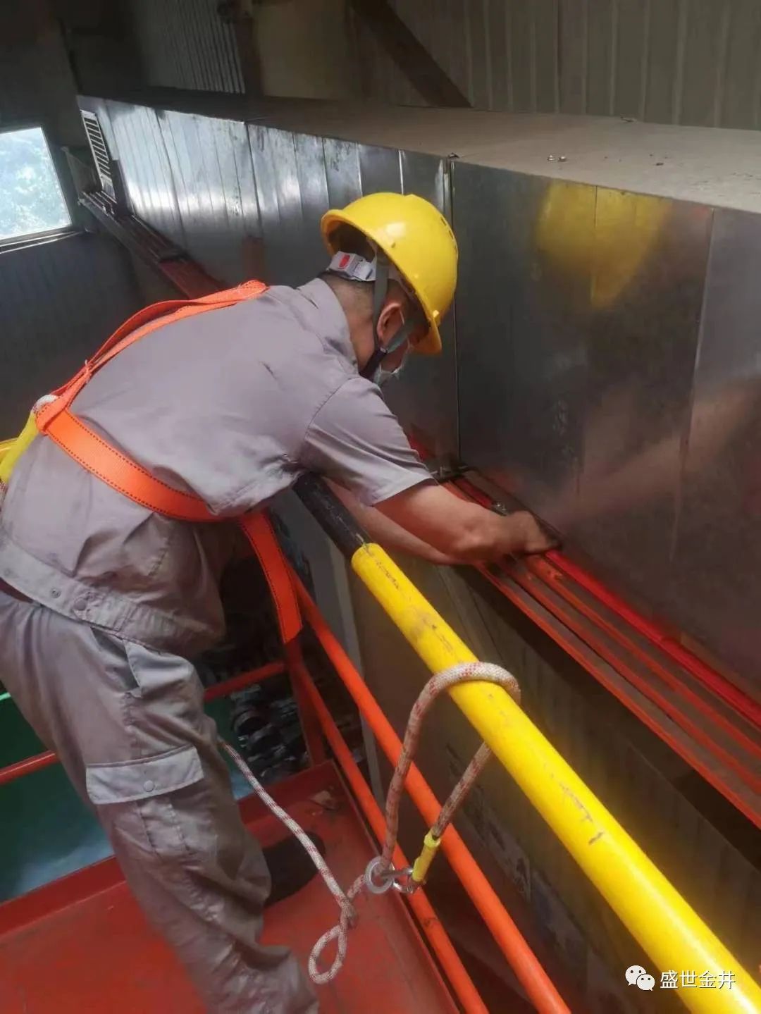 本次維修主要是安裝龍門吊的劃線把原來的三級劃線升級成四級的劃線。四人在40度高溫的環(huán)境下,在悶熱的車間進(jìn)行線路改造,高處行走、攀爬維修。根據(jù)安全規(guī)范要求,不管天氣再熱都要“全幅武裝”穿著工服,戴著安全帽,沒過幾分鐘汗流浹背,工作服干了又濕,濕了又干,黏在皮膚上,但他們毫無怨言。等所有維修工作安裝完成后,他們反復(fù)進(jìn)行測試,每個環(huán)節(jié)都不敢松懈。