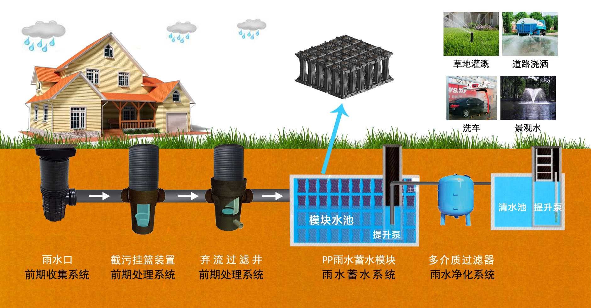 雨水落到地面后,經(jīng)過初期的截污、棄流處理,截留雨水中較大懸浮物與漂浮物,水匯集并儲存到模塊蓄水池,再經(jīng)過自然沉淀使雨水中的懸浮物質(zhì)(主要是可沉固體)在重力作用下沉淀,從而雨水分離,并經(jīng)過對收集的雨水進行處理后達到符合設(shè)計使用標準的系統(tǒng)。