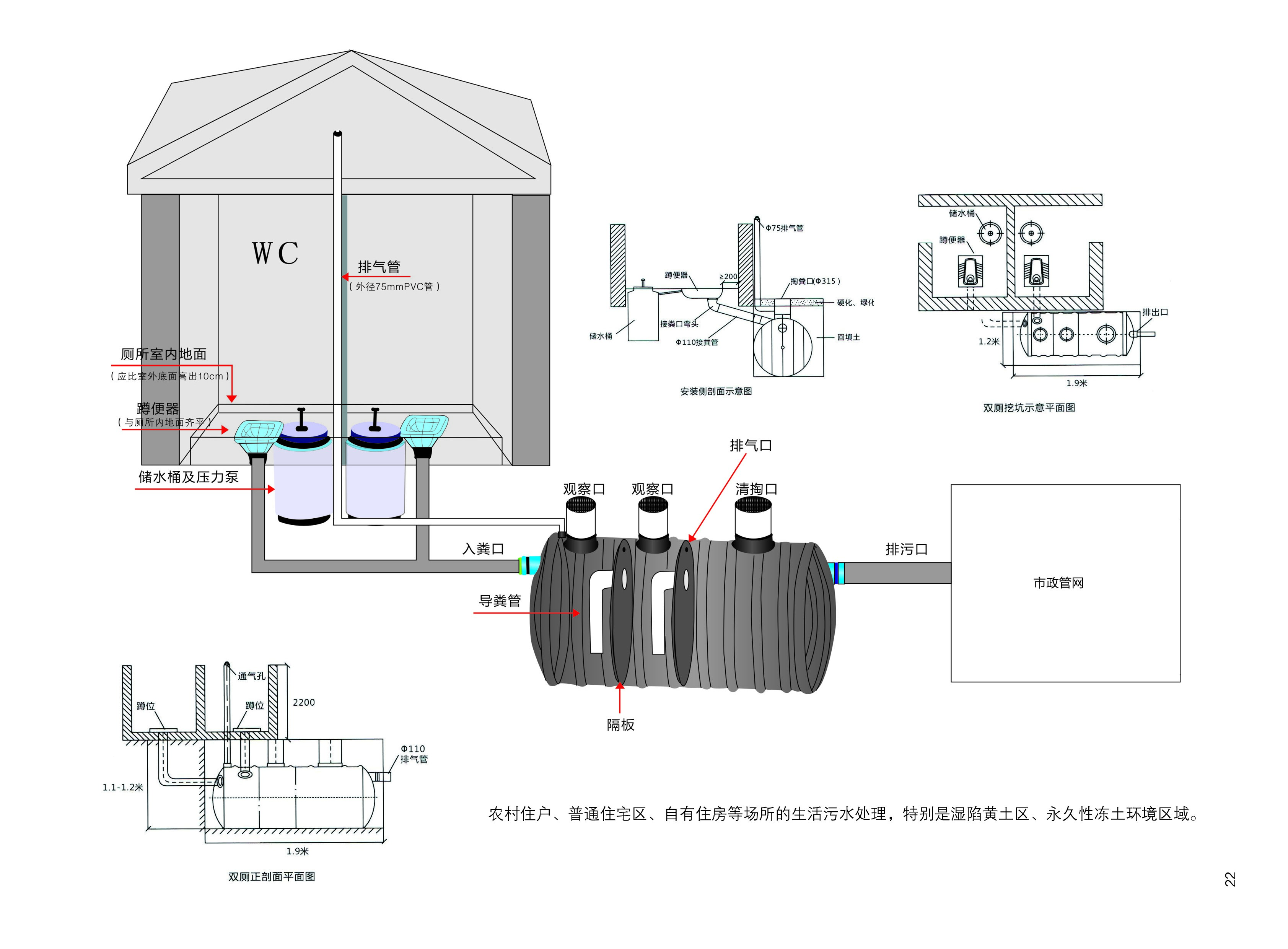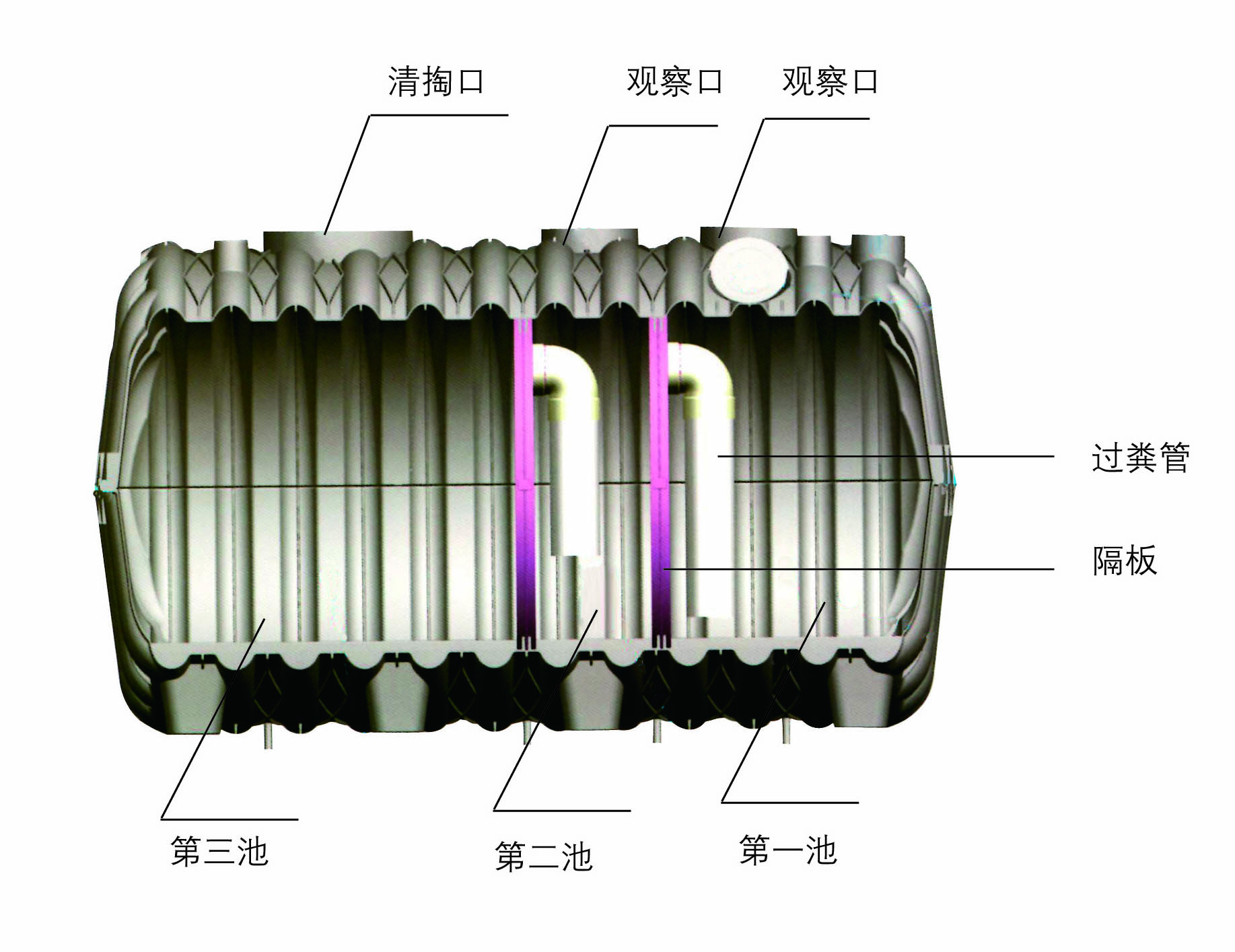 塑料“三格式”化糞池是處理糞便并加以過濾沉淀的設(shè)備,是一種環(huán)保型化糞池。其原理是固化物在池底分解,上層的水化物體,進(jìn)入管道流走,防止了管道堵塞,給固化物體(糞便等垃圾)有充足的時(shí)間水解。 化糞池指的是將生活污水分格沉淀,及對(duì)污泥進(jìn)行厭氧消化的小型處理構(gòu)筑物。