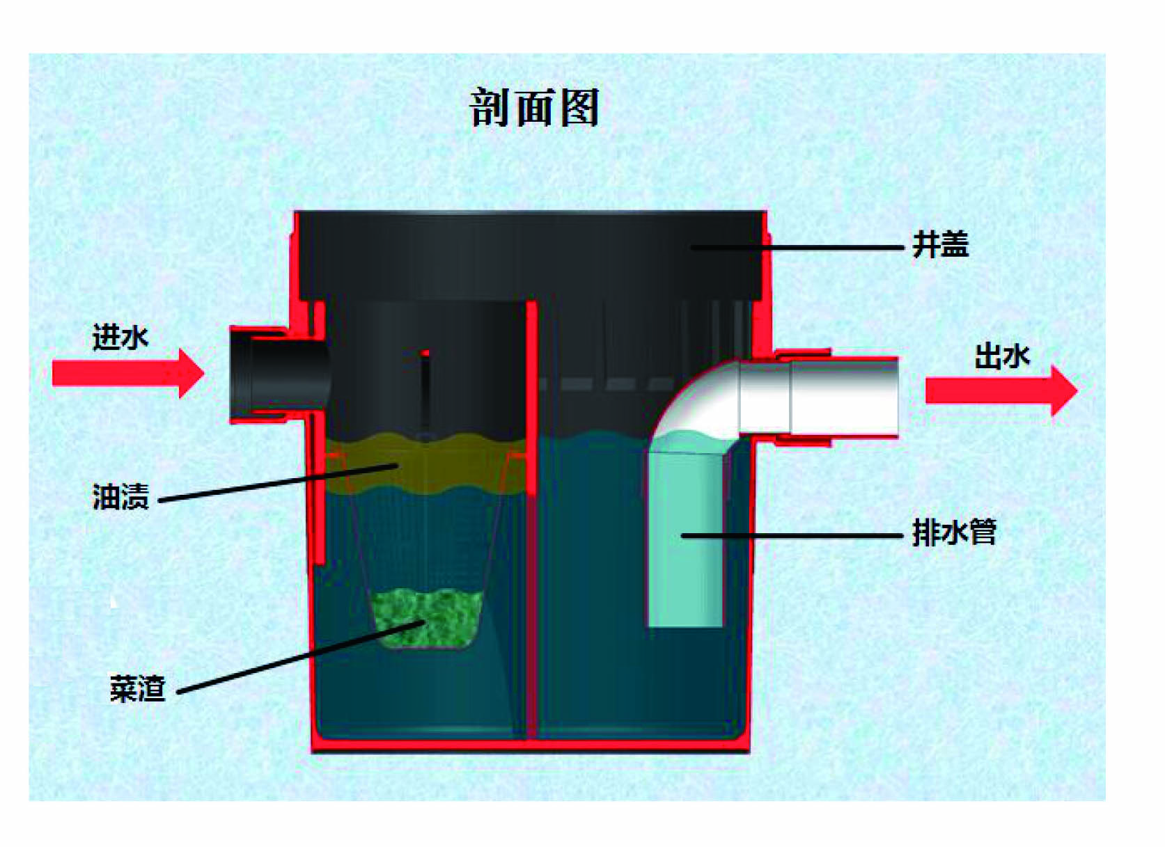 作用:將排出的油及其他雜物隔離在油污隔離井內(nèi)部,待后期清除掉,防止管道被堵塞。